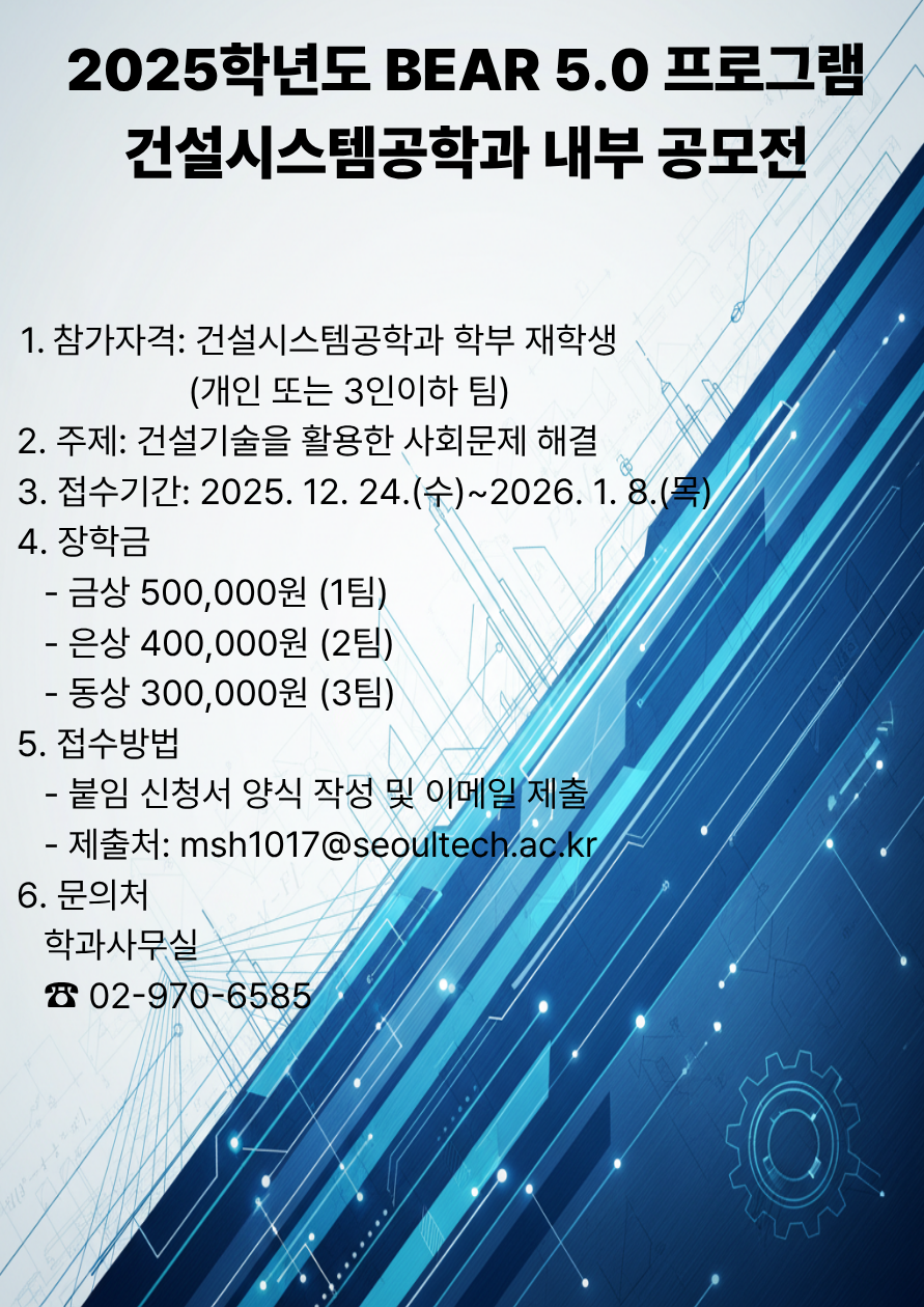 | 제목 | [학부] 2025학년도 BEAR 5.0 건설시스템공학과 내부 공모전 안내 (~1/8) | ||||